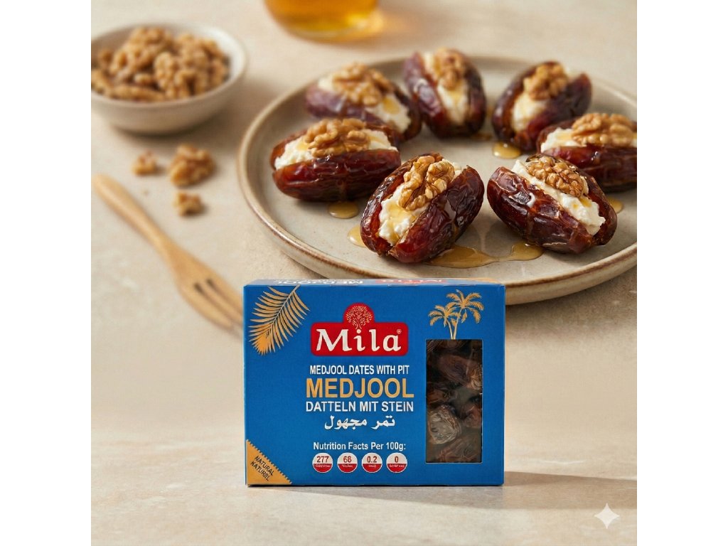Medjoolské datle patří k nejprestigíjnějším arabským zemmědělskim plodŭm. Vynikají jemným, medovým chutím a hustoým, sladkým měsem. Datle Mila jsou vyrobené bez umelých příchutí.