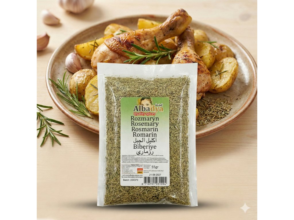 Rozmarýn Albadya - aromat bylinky s intenzivní vůní a lehce hořko-sladké chuti. Ideální pro grilované maso, pečení, brambory a středomořské speciality. Baleno v prášku pro snadné dávkování.