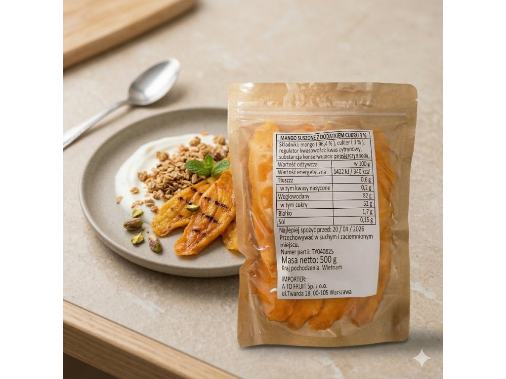 mango (96,4 %), cukr (3 %), regulátor kyselosti: kyselina citronová; konzervační látka: disiřičitan sodný.