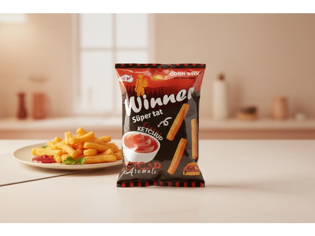 Křupavé kukuřičné tyčinky Winner s kečupovou příchutí – slané snacky vhodné pro rychlé občerstvení, ideální k filmu nebo na párty.